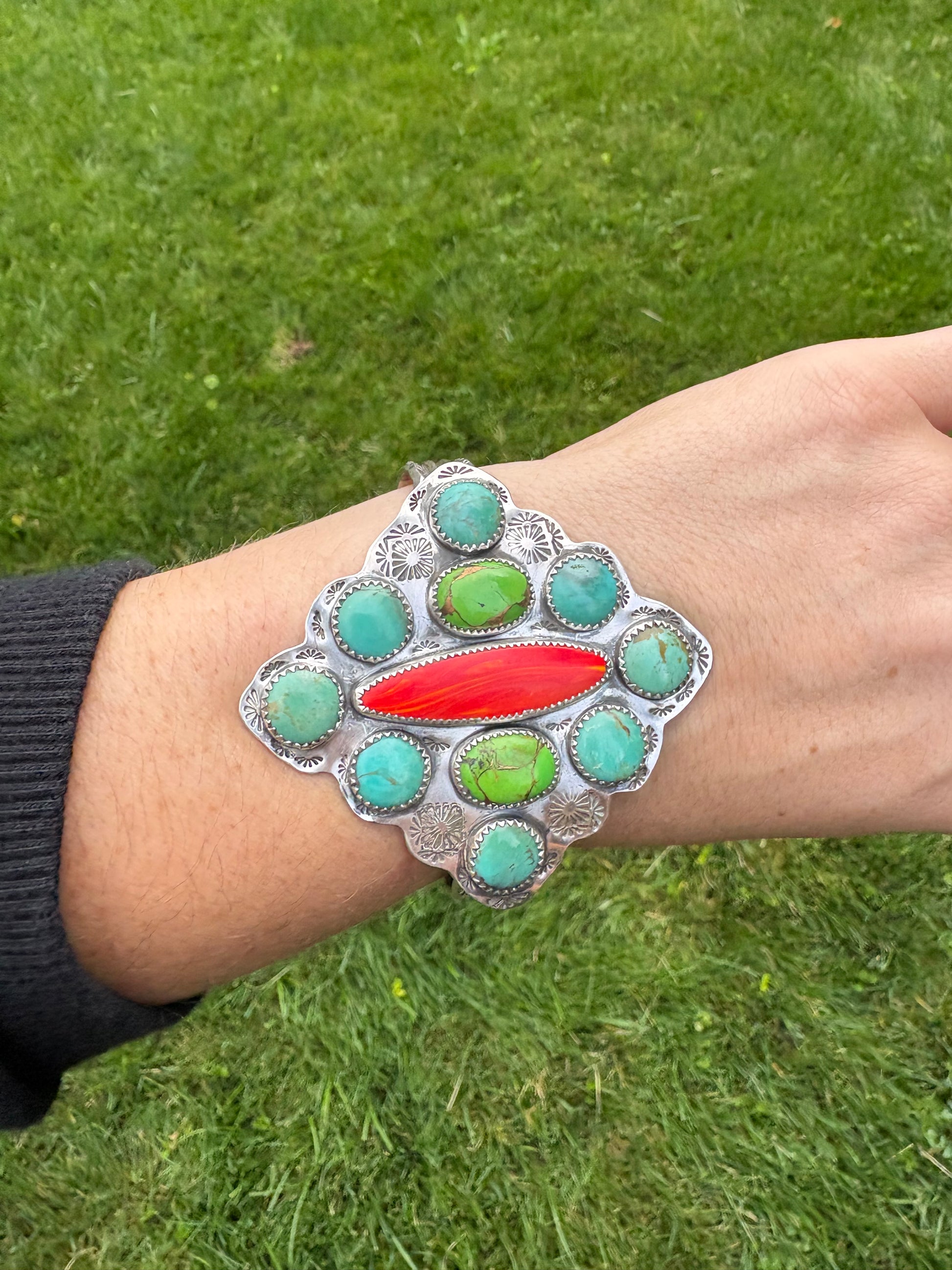 This statement cuff is made of sterling silver and features a long oval roserita, two oval green mohave turquoise, and eight round Kingman turquoise stones. Fits a small/medium size wrist.