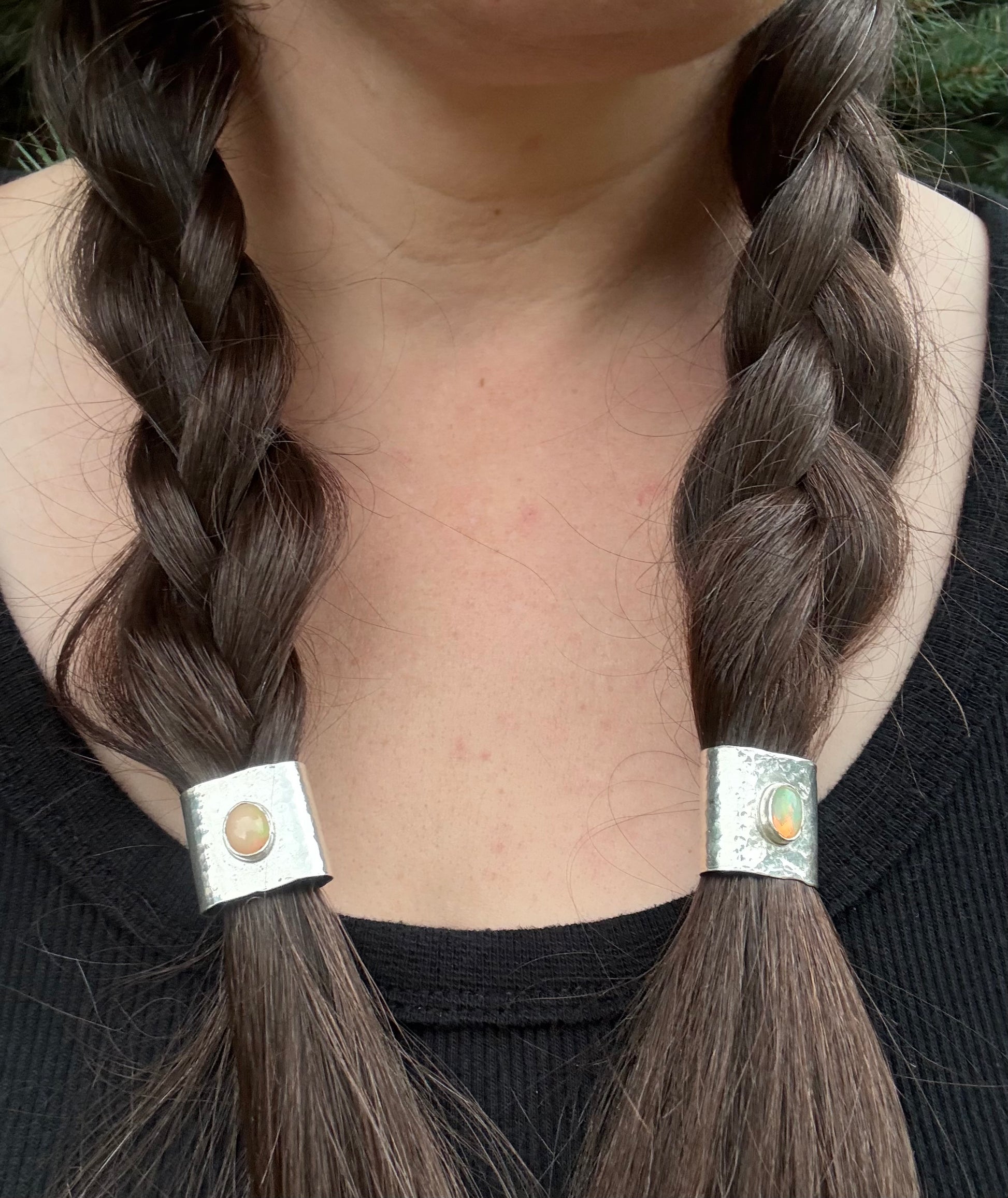Sold as a pair of braid cuffs for people who wear their hair in two braids or pony tails **OR** you could keep one and share the other with your BFF! The Kingman Turquoise and Pink Conch Shell cuffs are larger for thicker braids, the spiny oyster shell is a medium size, and the Ethiopian opal style is smaller for thinner braids.